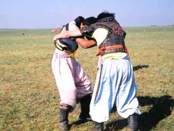 Chinese wrestling is classified into 10 levels according to the athletes' weight. The wrestling uniform consists of a white jacket that comes no further than the elbow, white silk pants and black laceless boots. A white belt is tied around the waist. In competition, grabbing the jacket to manipulate for a throw was allowed, but not the grabbing of the pants. You are allowed, within reason, to kick your opponent's shins and ankles to set up a throw. You can also punch him to set him up -- so long as you are holding him by the jacket.