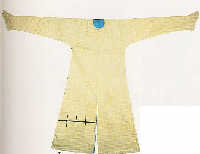 Men's long gowns were mostly blue, gray or green; and women's, white. Some women decorated their gowns with beautiful silk ribbon laces at the front, the neckline and sleeve margins.