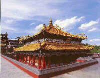 The temple is divided into three parts: the middle, the front and the back. The front part consists of the Temple Gate, the Five-Hole Bridge, the Stele Pavilion, the Stone Lion, and the White Platform, etc; the main building in the middle part is a big three-storeyed red platform, on four corners of which each is built a small hall surrounded by walls. In the middle of the red platform is the Hall of Divinity and Solemn with pointed double-eave roof covered with fine gold bronze tiles looking like fish scales, on the ridge of which stand eight copper gold dragons, soaring into the sky and appearing grand and magnificent. There are statues of Sakyamuni and Arhats worshiped in the hall. On the west of the platform is the Wanfa Zongyuan Hall, which was the bedroom of the Panchen Lama. The Jinhe Hall in the back was the domicile for the pupils. There is a colorful and gorgeous Multi-Colored Glazed Pagoda in the backmost part of the temple. The seven-floored pagoda, appearing octagonal, towers aloft on the top of the mountain, which is the symbol of the Temple of Sumeru Happiness and Longevity.