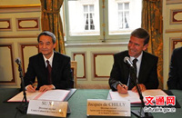 The China Cultural Center and Institut Franco-Chinois de Lyon, a French university, jointly signed a cooperative agreement on Nov 5. Su Xu, deputy director of the China Cultural Center in Paris and Jacques de Chilly, director of the Lyon regional development agency, Aderly, attended the signing ceremony.
