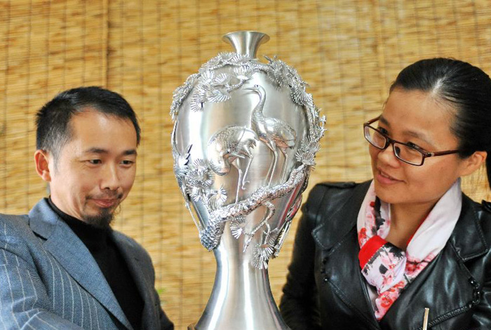 Zheng Tiansi, a tin carving artisan, works on a tin phoenix sculpture at his studio in Xiamen, Southeast China's Fujian province, Dec 26, 2014.