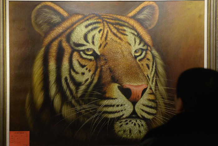 Visitors enjoy oil paintings from the Democratic People's Republic of Korea (DPRK) at the Hebei Library in Shijiazhuang, capital of North China's Hebei province, Dec 14, 2014.