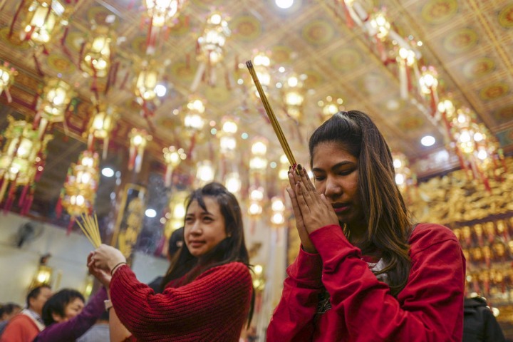 People pray with incense at the Thien Hau Temple to celebrate the first day of Chinese Lunar New Year in Los Angeles, the United States, Feb 16, 2018.