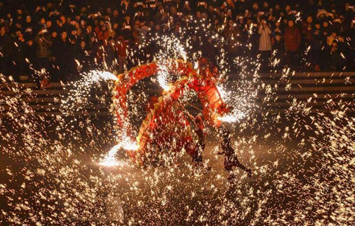 People perform a fire dragon dance in a shower of molten iron sparkling like fireworks to welcome the Spring Festival in Taierzhuang ancient town in Zaozhuang, East China's Shandong province, Feb 16, 2018.