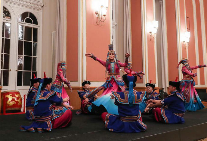 Dancers from Chinese Inner Mongolia autonomous region perform during the "Happy Chinese New Year" gala at the Red City Hall in Berlin, capital of Germany, on Feb 5, 2018.