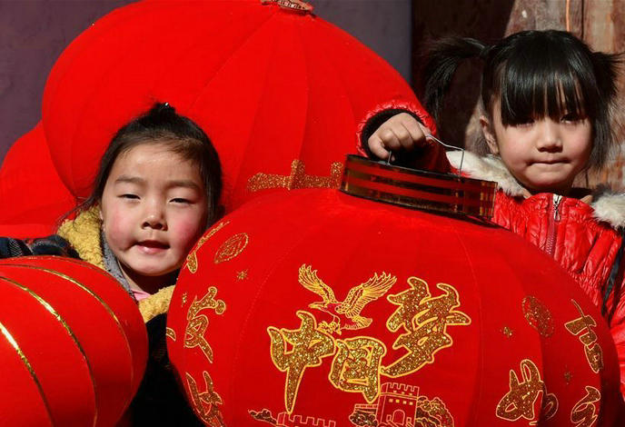 Villager make red lanterns for the upcoming Spring Festival at a workshop in Beileng township of Wenxian county, Central China's Henan province, Feb 7, 2018.