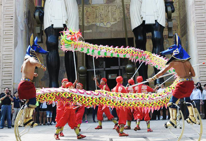 A dragon dance troupe performs at Universal Studios Singapore as part of Lunar New Year celebrations on Feb 8, 2018.