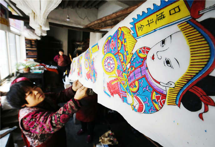 Folk artists make New Year pictures in Yangjiabu village of Hanting district in Weifang, East China's Shandong province, Jan 29, 2018, to cope with the demand of festival market.