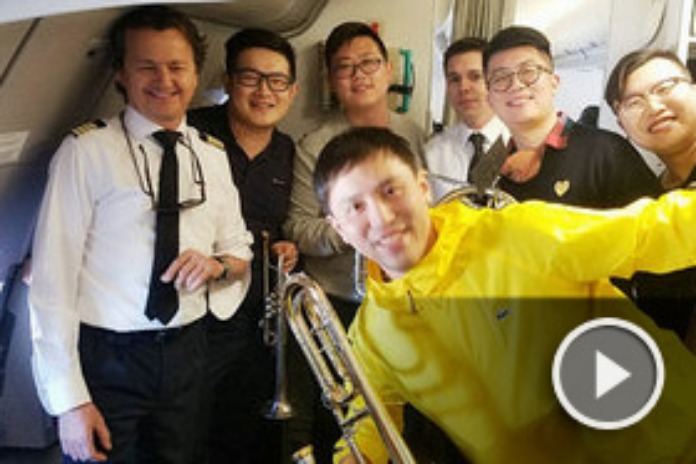 Five young Chinese musicians from Zhejiang province gave a surprise to passengers on a flight to Madrid, Spain, Jan 31.