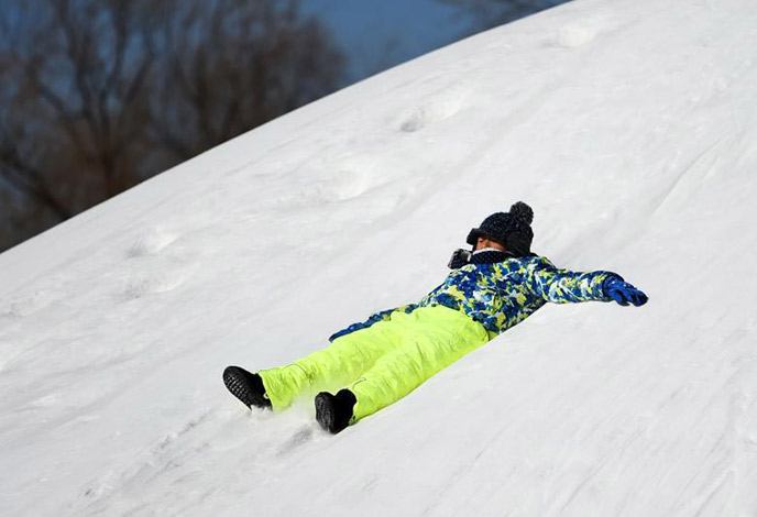 A visitor enjoys a "snow slide" at the Sun Island International Snow Sculpture Art Expo park in Harbin, capital of Northeast China's Heilongjiang province, Feb 17, 2018. Snow scenery here attracts tourists to enjoy the outdoor pleasure during the week-long Spring Festival holiday.