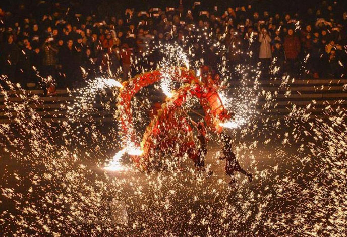 People perform a fire dragon dance in a shower of molten iron sparkling like fireworks to welcome the Spring Festival in Taierzhuang ancient town in Zaozhuang, East China's Shandong province, Feb 16, 2018.