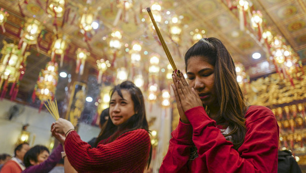 People pray with incense at the Thien Hau Temple to celebrate the first day of Chinese Lunar New Year in Los Angeles, the United States, Feb 16, 2018.