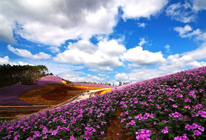 Recently, a large patch of mountainous land at the Blue Mountain scenic area in Changtai county of Fujian province has flourished, with various flowers in bright colors.