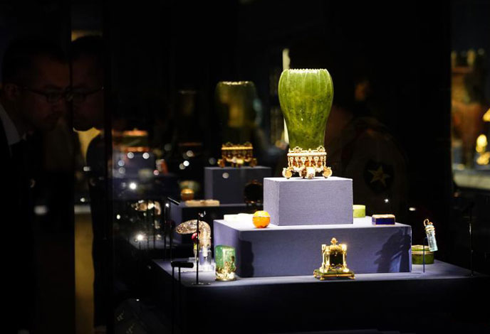 Items on display during the Treasures from the Al Thani Collection at the Meridian Gate (Wu Men) of the Palace Museum in Beijing, April 17, 2018.