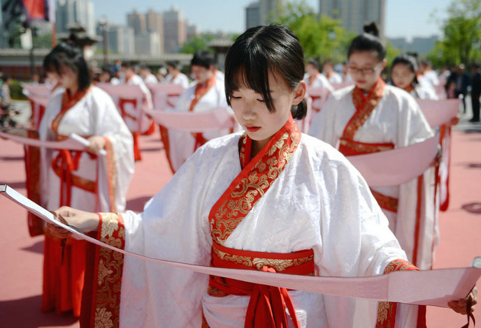 More than 50 young girls clad in hanfu, or traditional Chinese clothing took part in a coming-of-age ceremony to mark their entry into adulthood near Hancheng Lake in Xi'an, Northwest China's Shaanxi province on April 7.