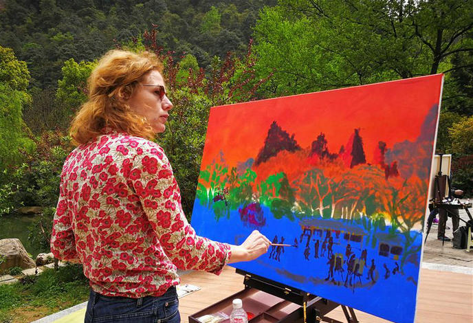 Giorgio Distefano from Italy paints at Zhangjiajie UNESCO Global Geopark at Wulingyuan district of Zhangjiajie city, Central China's Hunan province, April 6, 2018.