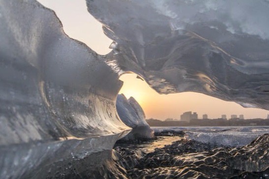 As temperatures rise above freezing in Changchun, capital of Northeast China's Jilin province, ice on Nanhu Lake is beginning to melt.